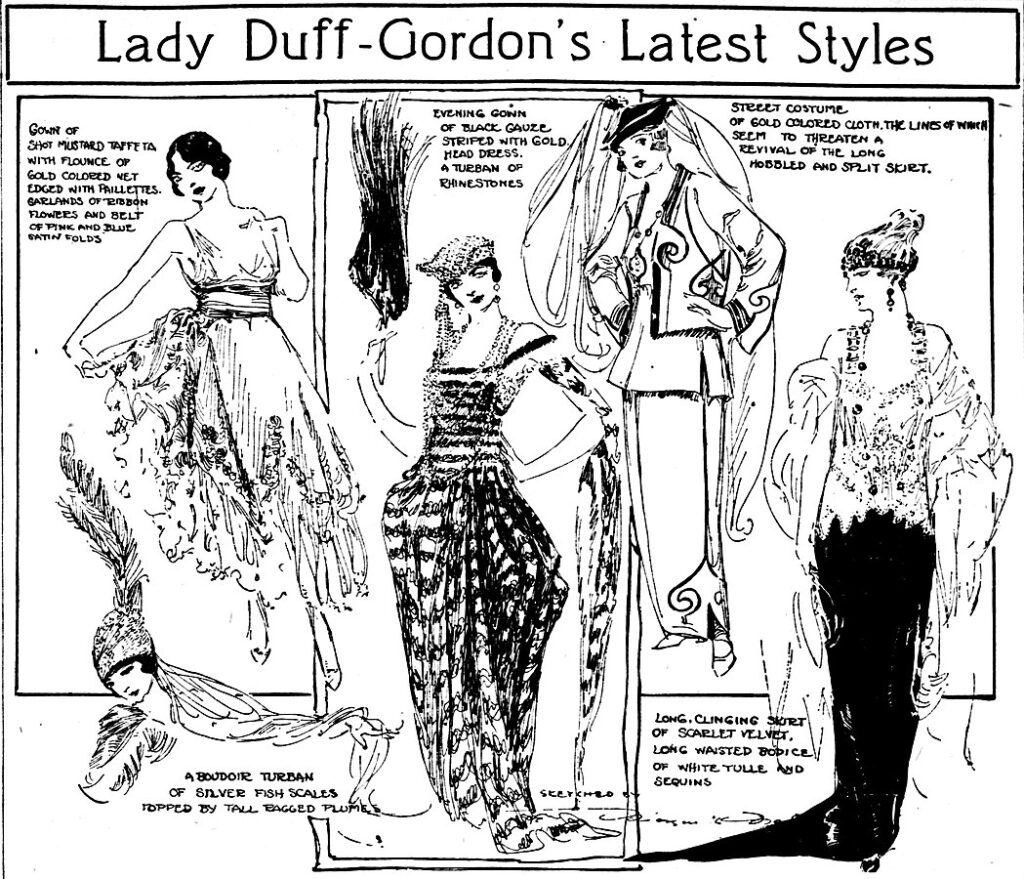 One of the most influential fashion figures on Titanic was Lady Lucile Duff-Gordon, a first-class passenger and successful fashion designer. She ran the fashion house Maison Lucile, which had locations in London and New York. Lady Duff-Gordon is credited with several fashion innovations, including the introduction of the split skirt, holding the first formal fashion shows with trained models (“manikins”), and designing contemporary lingerie. Though the Duff-Gordons had not originally planned to sail on Titanic, urgent business in New York prompted them to board the Ship in Cherbourg.